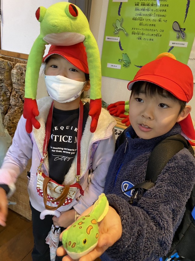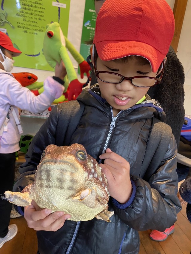 カエル館での様子です。カエルの様子を見たり、ぬいぐるみを触ったりして楽しんでいます。