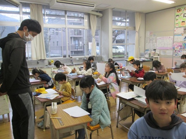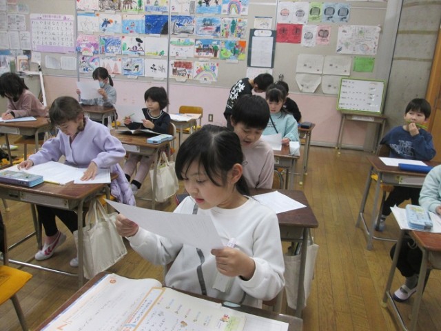 1年2組は国語「ろくべえ まってろよ」の学習です。みんなの感想を先生がプリントにまとめてきてくれました。それを読み合っています。お友達の感想はどんなことが書いてあったかな?