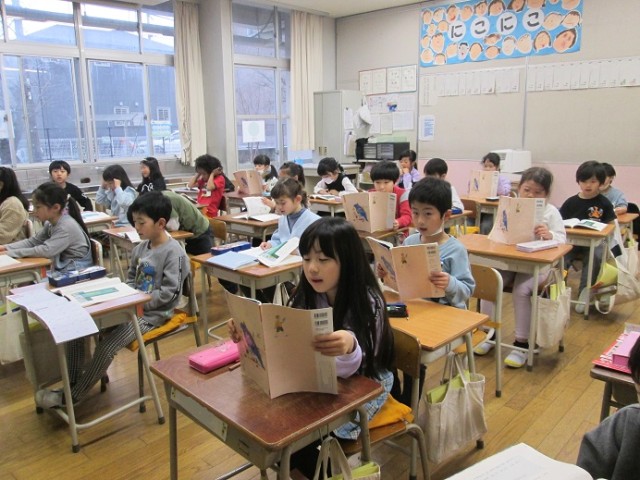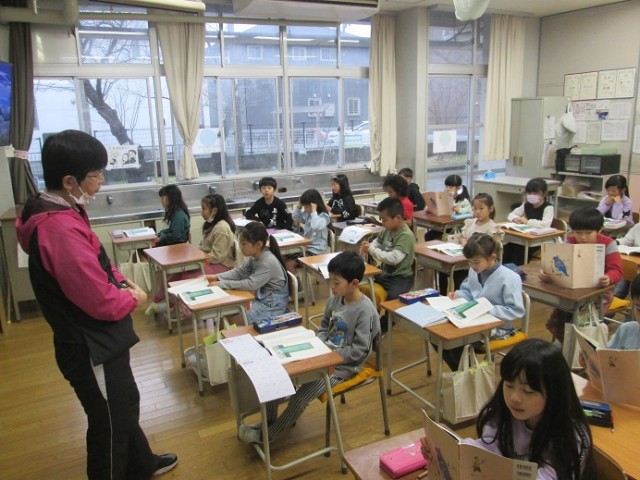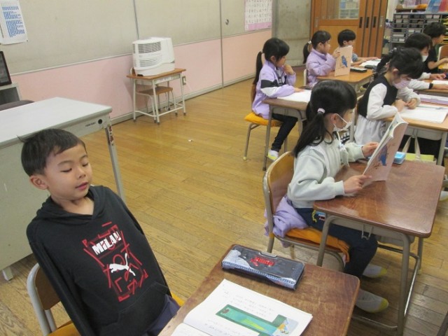1年4組は国語「ろくべえ まってろよ」の学習です。みんなで、音読をしています。すらすらと読めるようになってきています。