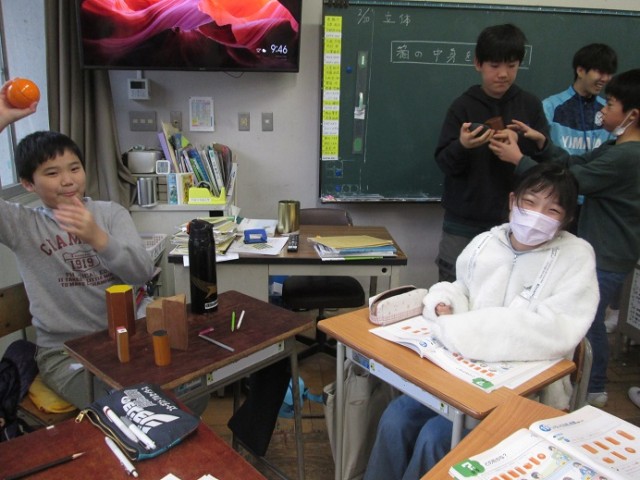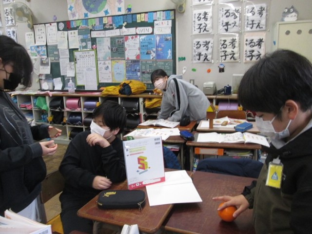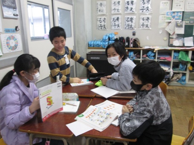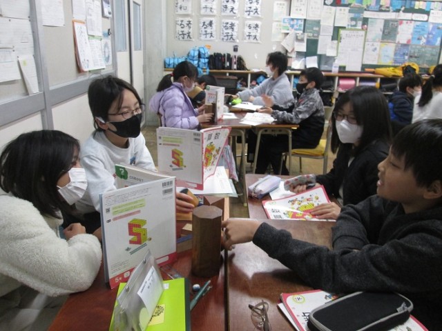 5年2組は、算数「立体」の学習です。教科書で立体模型をかくし、「面の数は5個です。」など、ヒントを出しながらその立体が何なのかを当てるゲームをグループでしていました。とても楽しそうに取り組んでいます。