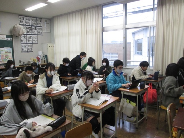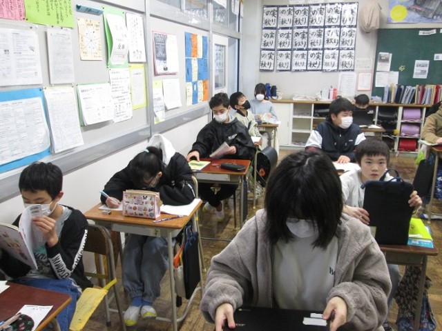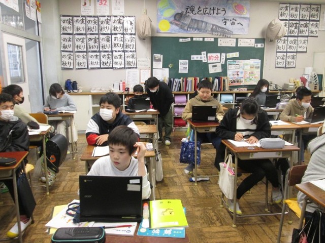 6年3組は国語「資料を集めよう」の学習です。Chromebookを使って調べ学習をしていますが、その出典(出所)を明らかにしていくことが大切であるということを学びました。