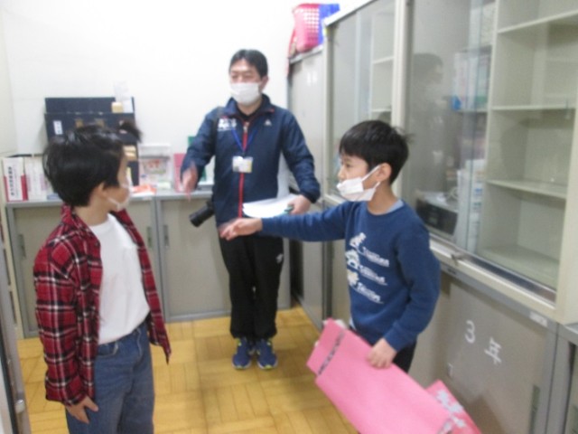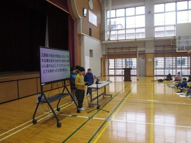 今日は、4年生がこれまで江原素六先生について学んできたことを、明治資料館の方や江原素六先生顕彰会の方々に発表する日です。校長室で待機していただいている間に、大谷翔平選手からいただいたグローブを披露させていただきました。そうこうしていると、4年生の案内係の子が校長室にお客様を迎えに来てくれました。