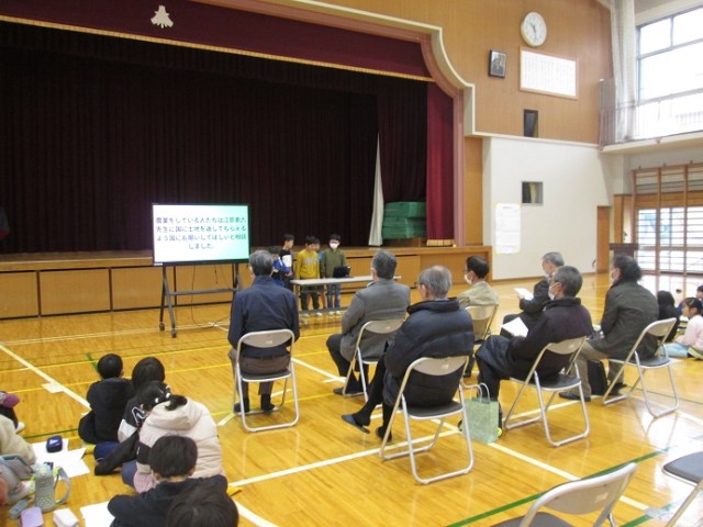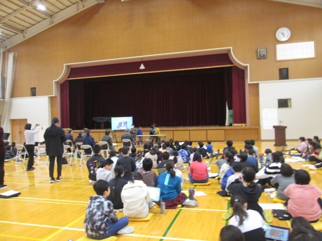 体育館に集まり、第1部の発表会が始まりました。11のグループが代表で発表します。大画面にキャストするのも、もうお手のもの。どんどん自分たちでプレゼンしていきます。その発表は自信に満ちあふれています。