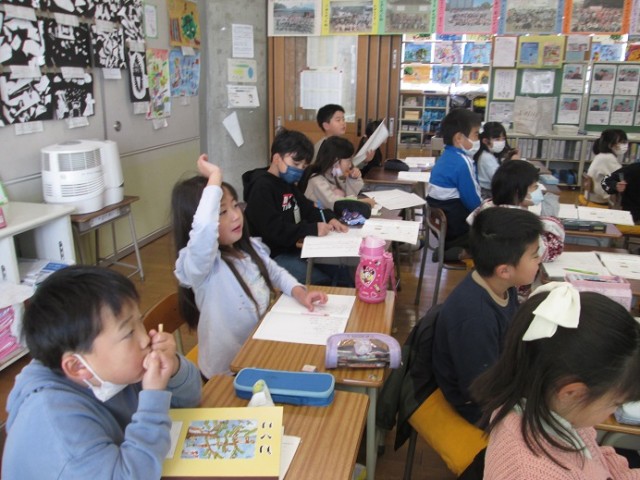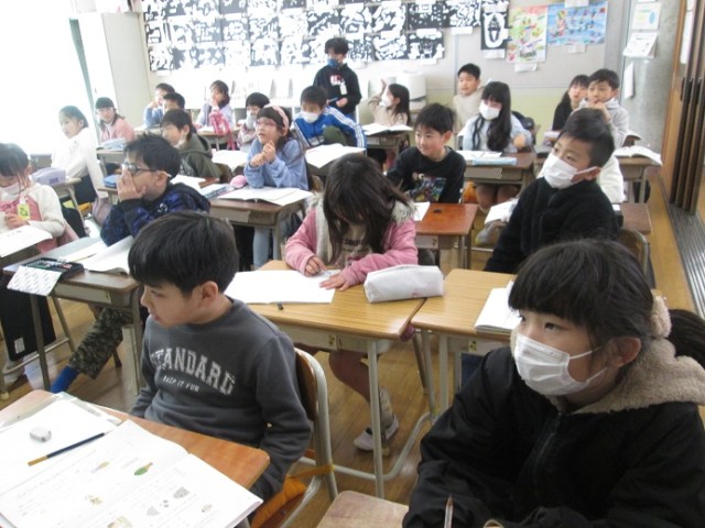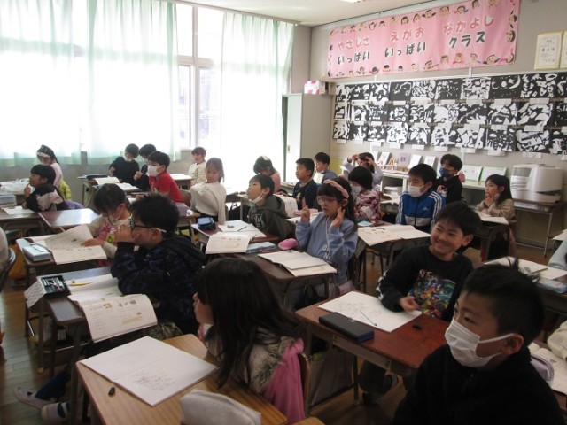 2年1組は国語「言葉のいずみ」の学習です。漢字2文字でできている言葉について学習しています。日光、白鳥、高山、強弱などなど、身の回りにはたくさんの言葉があり、どんな漢字が並んでいるかのついて学習していました。積極的に発言する姿がありました。