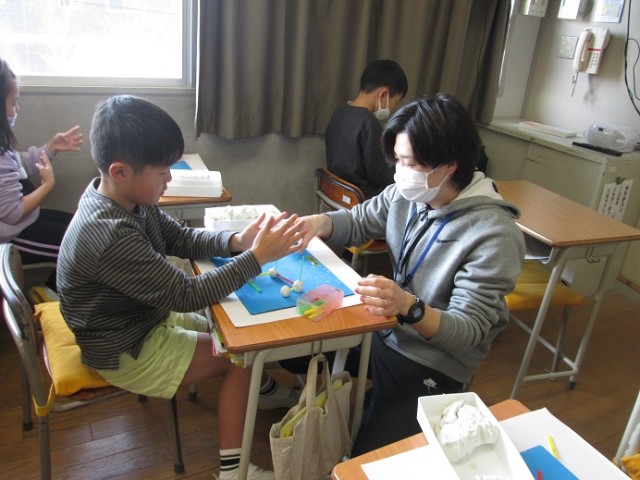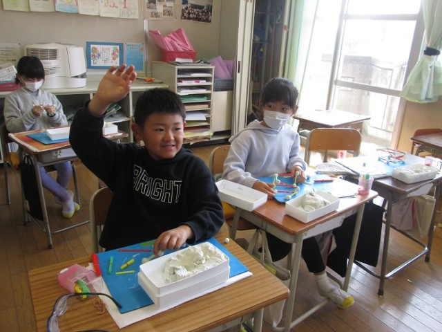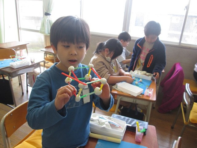 2年2組は算数「棒と粘土で箱を作ろう」の学習です。箱を作るのに長い棒が何本、短い棒が何本、粘土の玉が何個と数えながら作成しました。