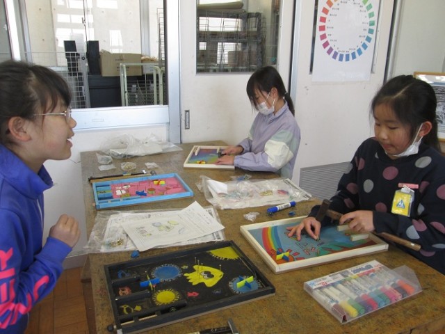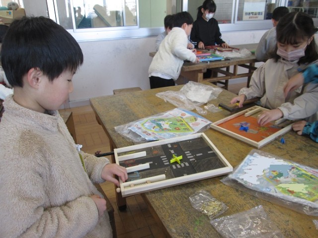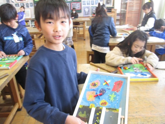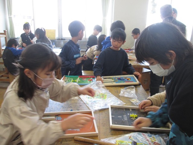 3年1組は図工「くぎ打ちトントン」の学習です。「やってみて!」とうれしそうにやらせてくれるがいました。釘にビー玉が当たり、どこに行くのか予想しにくいところが面白さの醍醐味ですね。