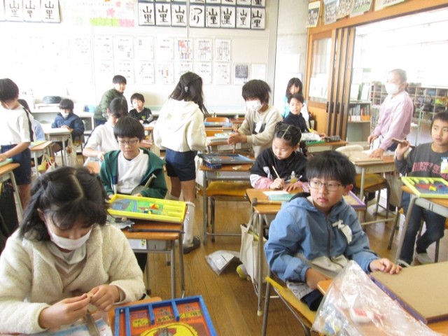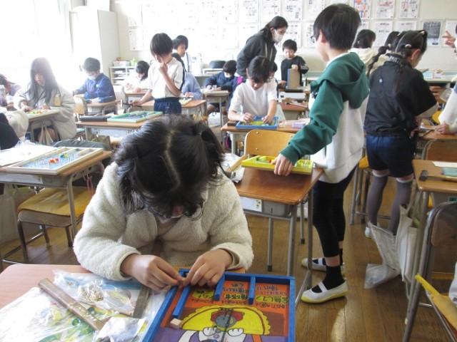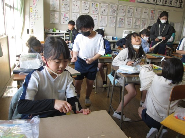 3年4組は図工「くぎ打ちトントン」です。今日は3組を除いて全クラスがくぎ打ちトントンの学習だったので3階じゅうに釘を打つ音が響いていました。