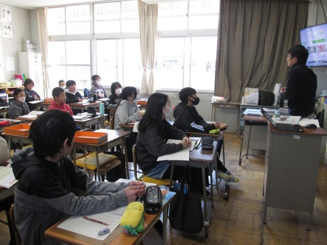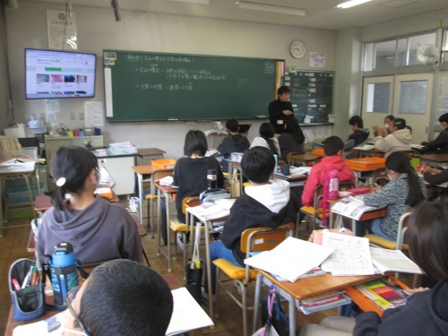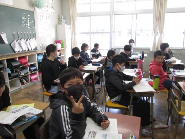 5年1組は社会科「火山の噴火や大雪への取組み」の学習です。雪対策として、車のスタッドレスタイヤの話題が上がっていました。「スノボやるから返るよ」「チェーンを使う」などのつぶやきが聞かれました。そのほかにも雪国は様々な対策をしていますね。