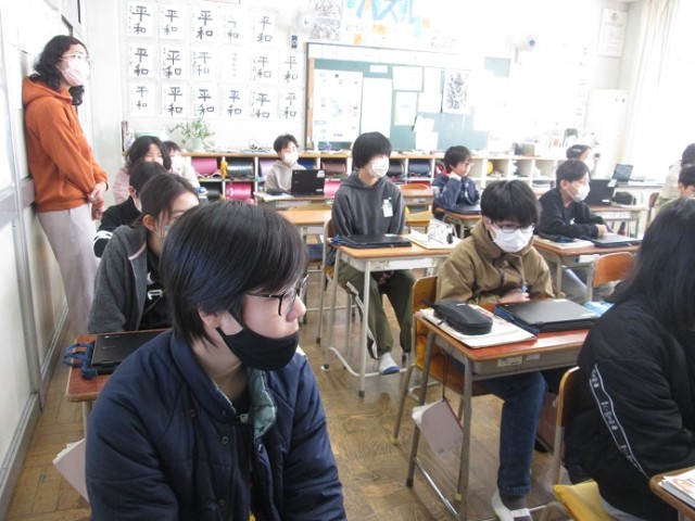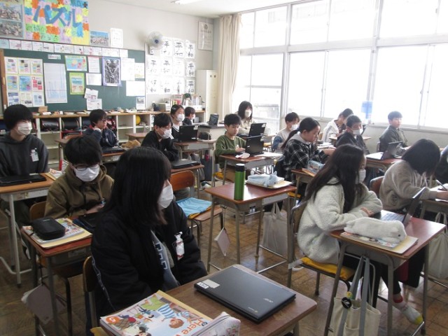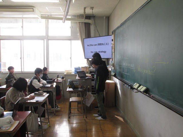 5年3組は、英語「あこがれの人をクイズで紹介しよう」の学習です。これがなかなかヒントの出し方が難しいようでしたが、みんな、前に出てクイズを出題していました。