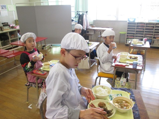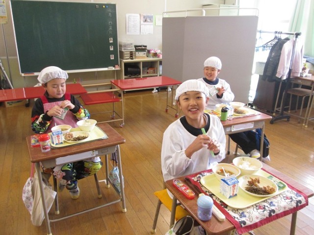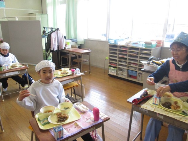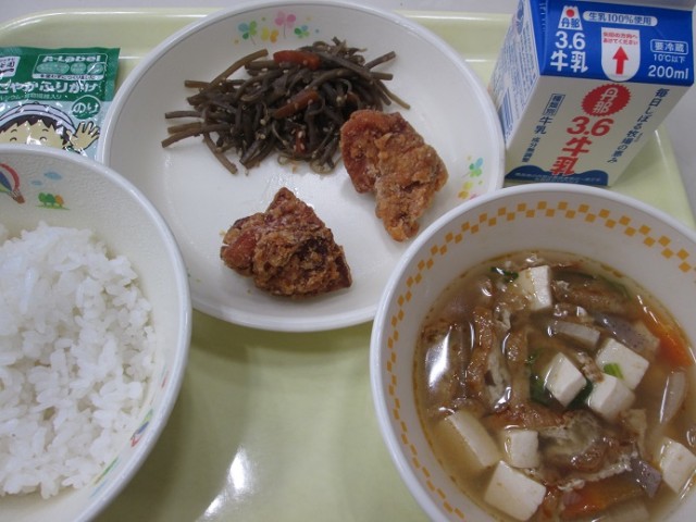 今日の献立は、鶏肉の唐揚げ、ゴボウのきんぴら、けんちん汁、ご飯、ふりかけ、牛乳です。今日は、6年生と中学3年生の人気のリクエストメニューが出されました。献立表の太字になっているところがリクエストメニューで、今日は「からあげ」がそのメニューです。明日のリクエストメニューも楽しみですね。