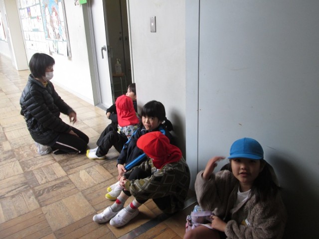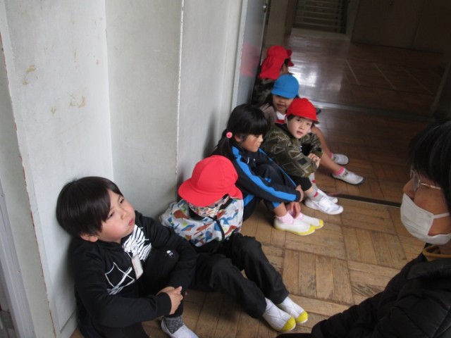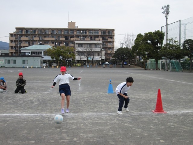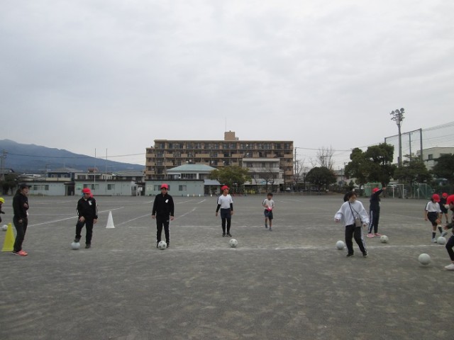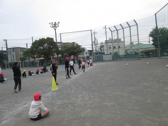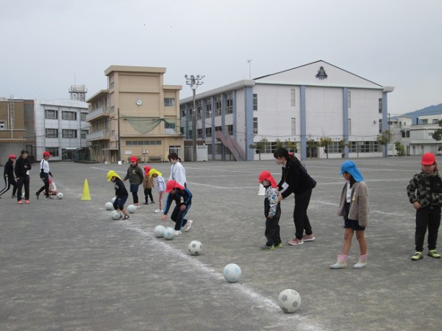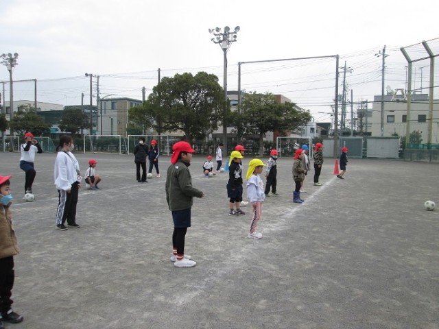 その後、外に出てボール蹴り運動です。曇り空で寒い中でしたが、みんな、元気よくシュートの練習をしていました。
