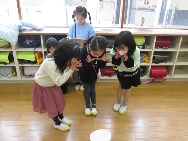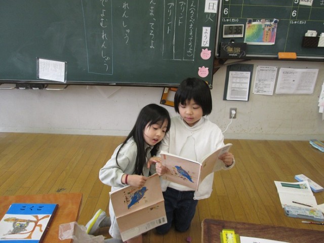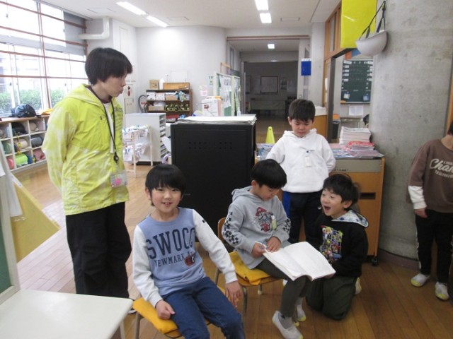 1年3組は国語「ろくべえ まってろよ」の学習です。グループに分かれて工夫した音読劇を練習していました。「見て。見て」とうれしそうに練習の様子を見せてくれた子たちもいました。穴に落ちているろくべえの紙を置いて、呼びかけています。会話は暗記していましたね。
