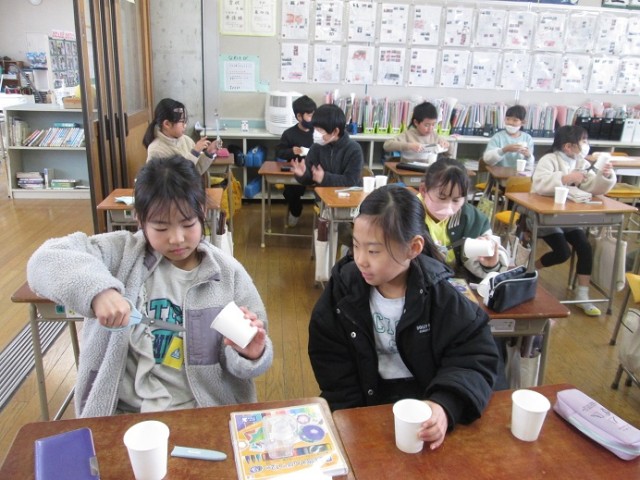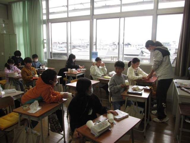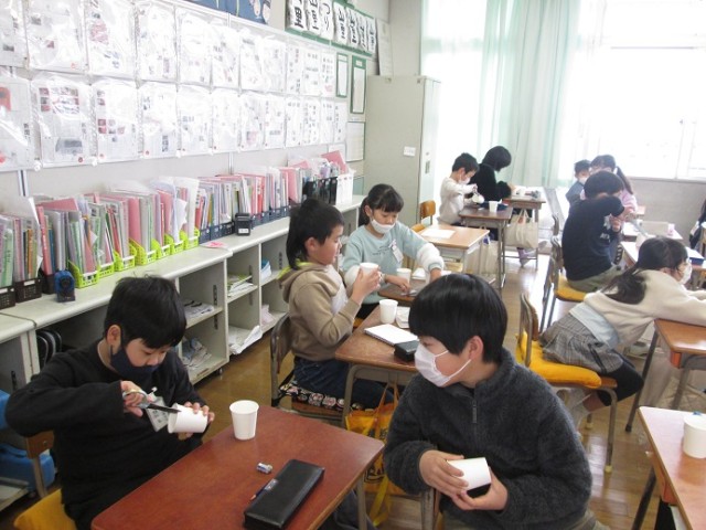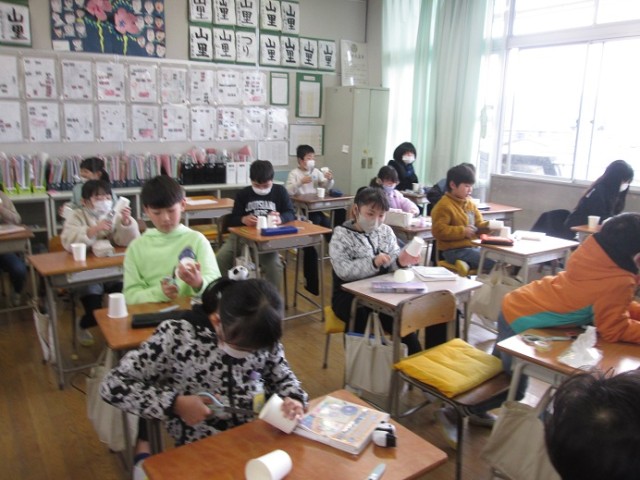 3年3組は理科「ゴムロケット作ろう」の学習です。紙コップをハサミで切りながらうれしそうに作っていました。「どうぞ」とハサミを貸す優しい姿も見られました。