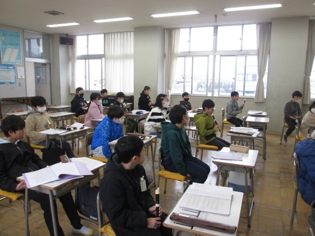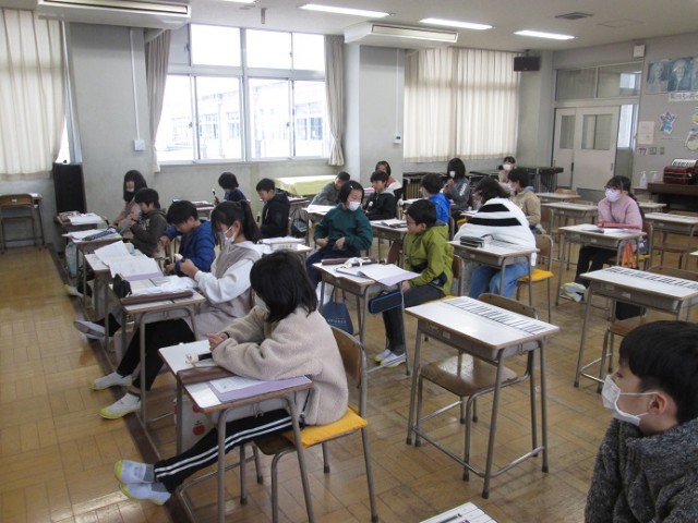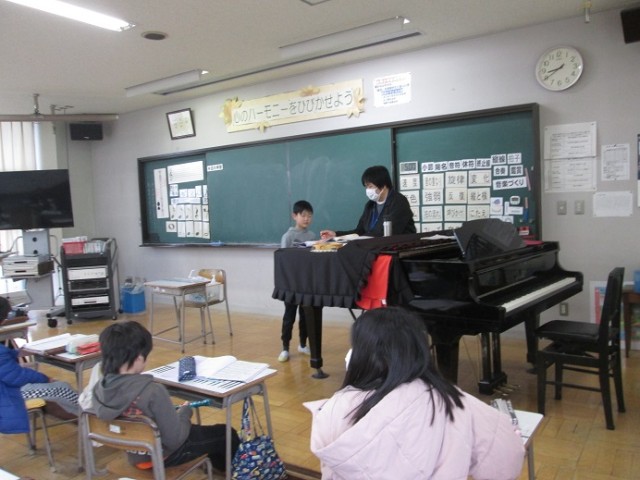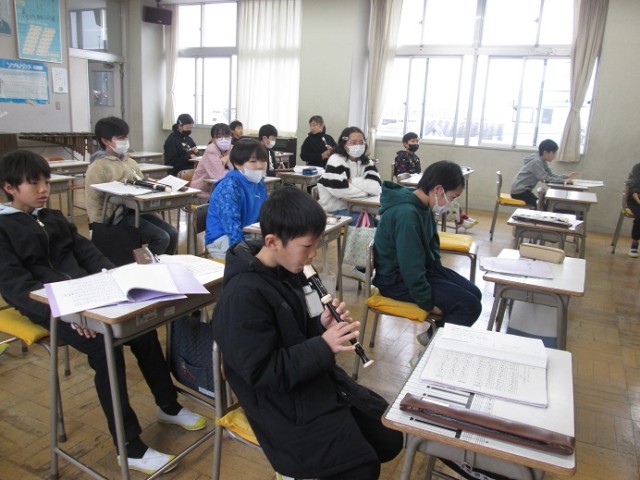 4年3組は音楽です。音楽の授業では1年間を通してリコーダーの進級テストに挑戦してきました。「おまけ!」と先生からギリギリ合格を告げられると、「やったー!」とうれしそうに声を上げる子もいました。また、合格すると合格シールをもらえます。こうした積み重ねが力になっています。