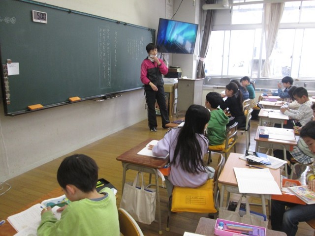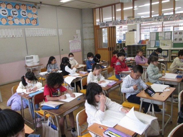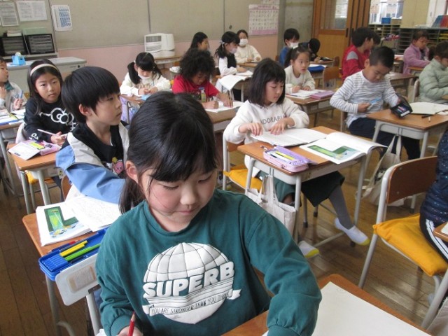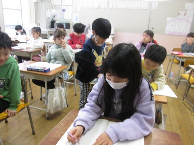 1年4組は国語「ろくべえ まってろよ」の学習です。「クッキーがかごから飛び出したときどんなことを思ったのか」という問いに、自分の考えをノートに書いています。理由も付けて書けるようになってきました。