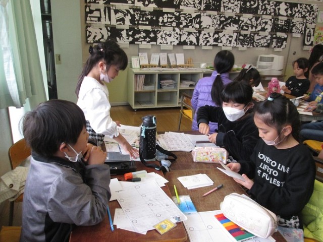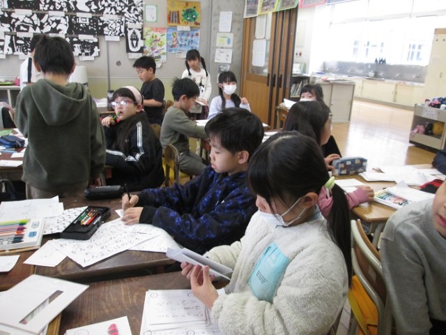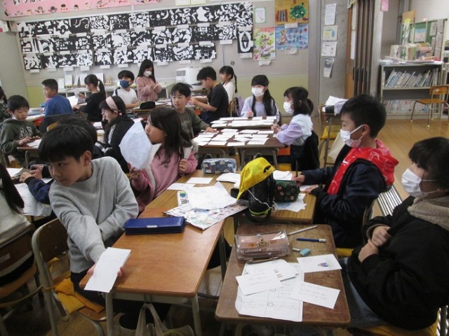 2年1組は読解「2年生カルタ」の学習です。「り:リレー大会 90m 3位でうれしい」「お:音楽 りんしょう つられてむずかしい」などなど楽しいカルタができはじめています。