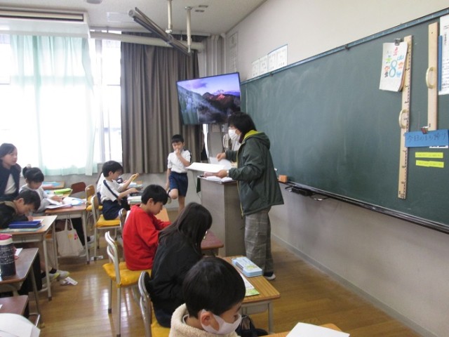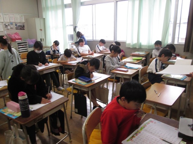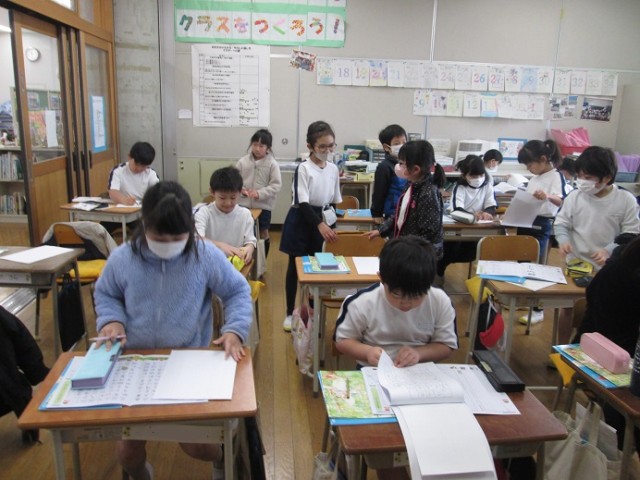 2年2組は書写「硬筆」の学習です。先生からこれまでの作品を返却されていました。1年間たくさん練習してきましたね。