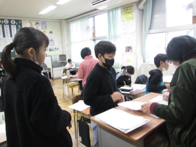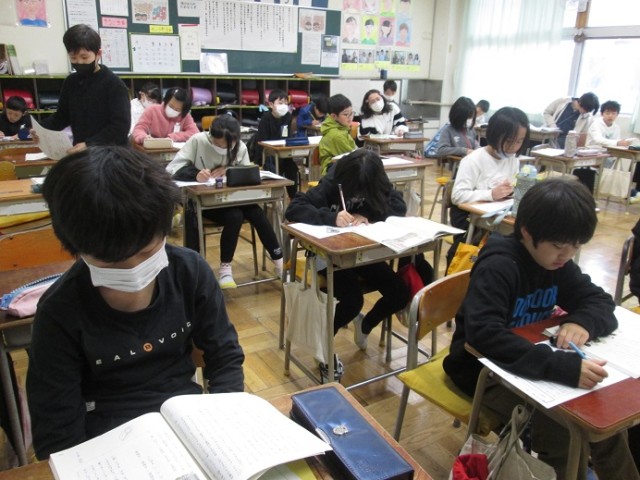 4年3組は国語「世界で一番やかましい音」の学習です。表現の工夫、特に呼びかけを見つけようというプリントに取り組んでいました。できた子は先生に出していました。