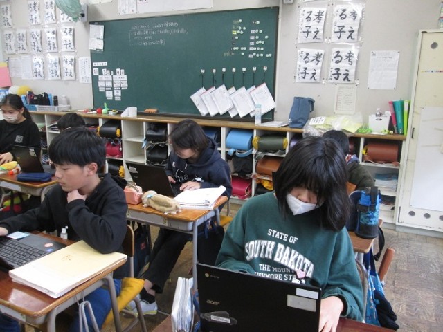5年1組は英語「My hero is my brother.」の学習です。My hero クイズを作っているところです。「He/She is a 職業」「He/She canできること」「He/She is 性格」などを当てはめながらヒントを作っています。