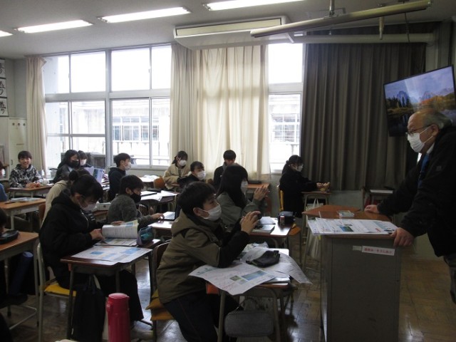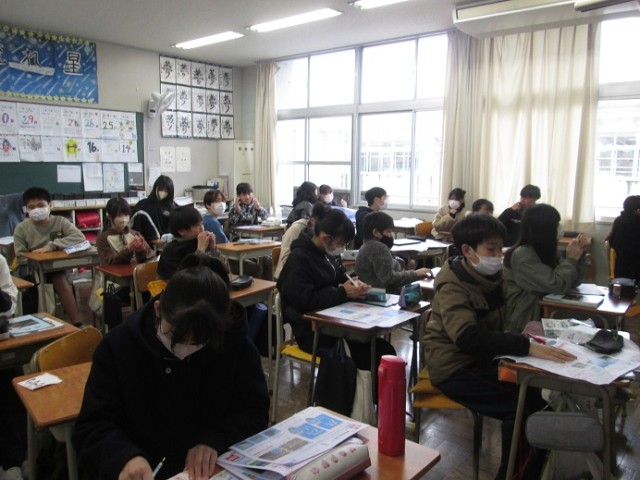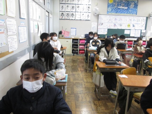 6年2組は理科のテスト返却です。先生から説明がされています。学年のまとめのテストなので、地層や人体、空気など多方面にわたる内容でした。