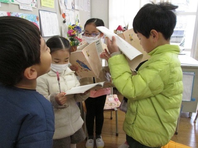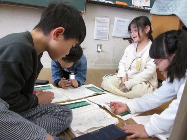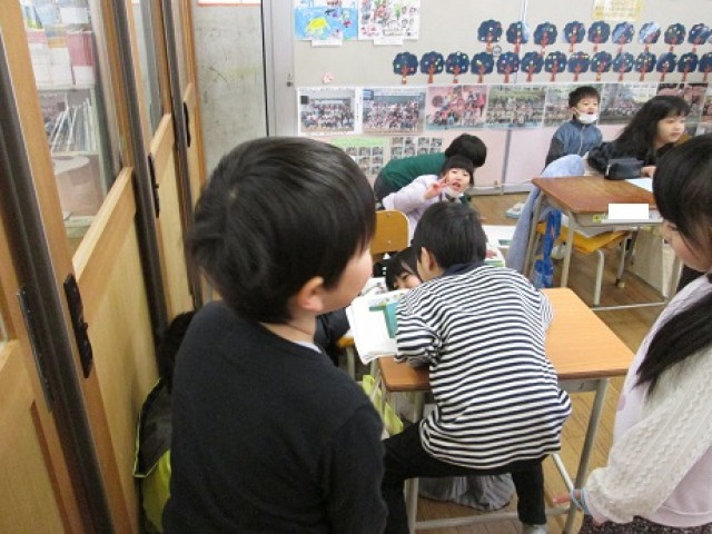 1年1組は国語「ろくべえ まってろよ」のグループ音読です。それぞれが役割分担をして、気持ちをこめて読む練習をしていました。
