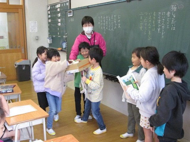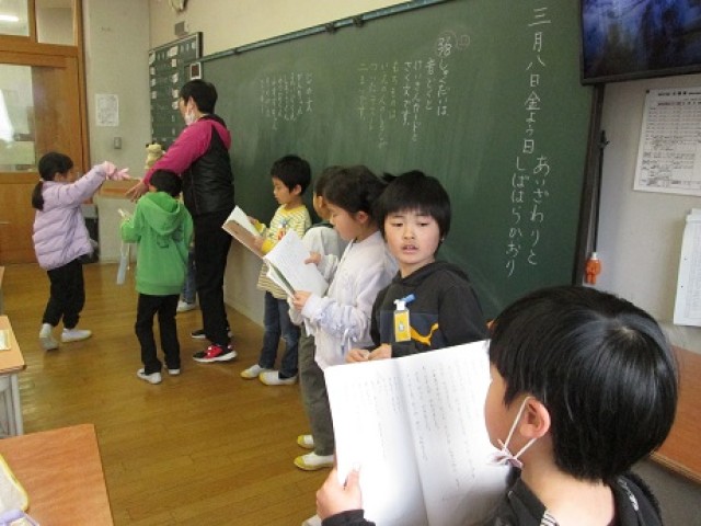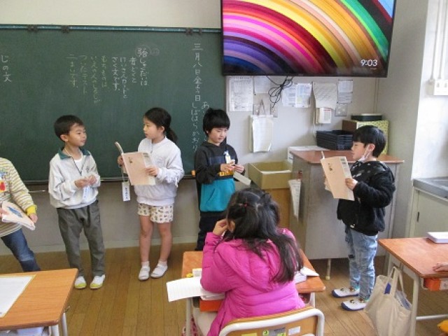 1年4組は国語「ろくべえ まってろよ」の役割を決めて音読会を行っていました。気持ちをこめて読んでいました。また音読に合わせ、パペットを使い簡単な寸劇をしました。みんな楽しみながら活動していました。