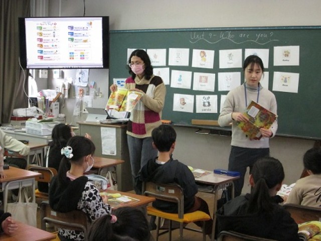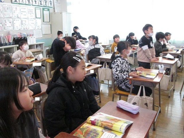 3年3組は外国語活動を行っていました。今日は「Unit9 Who are you? 」の学習でした。ALTが教科書の読み聞かせをしていました。