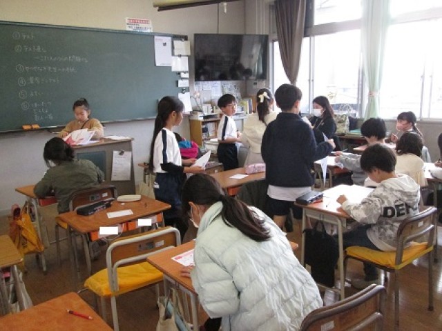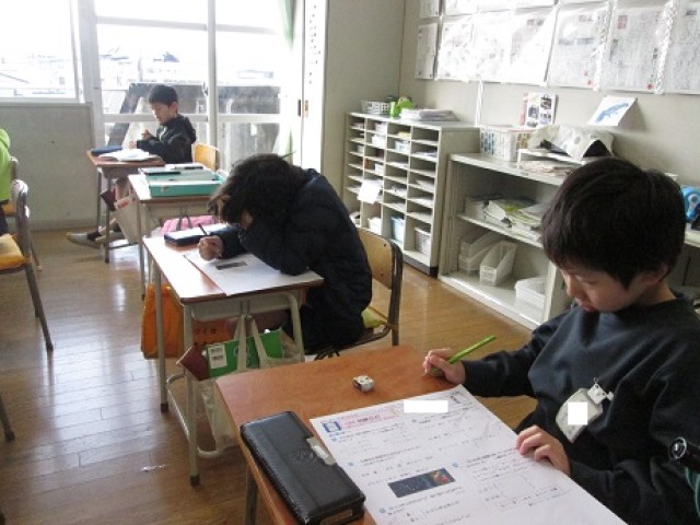 3年4組は国語で単元のまとめとして、振り返りのテストを行っていました。みんな集中して取り組んでいました。