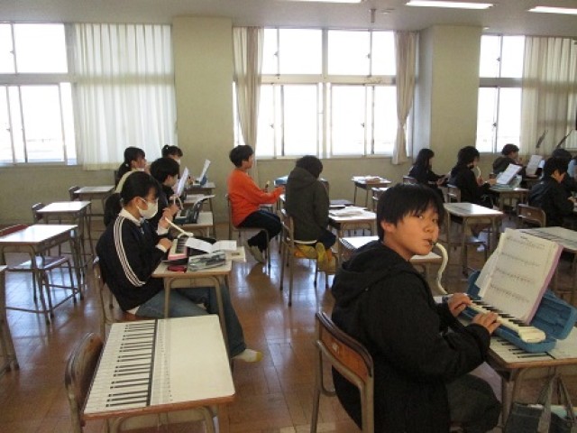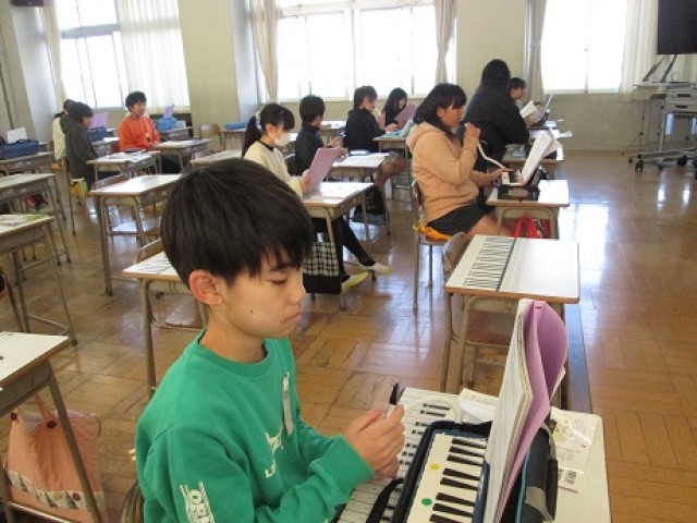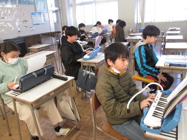 5年4組は音楽で「ほたるの光」について学習しています。鍵盤ハーモニカで合奏練習をしました。
