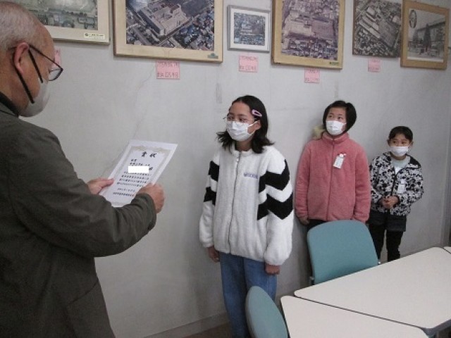 「書き初めコンクール」の表彰に引き続き、「明るい選挙啓発習字」の表彰を行いました。金賞を受賞した3名が、校長先生から代表で賞状を授与されました。誠におめでとうございます。