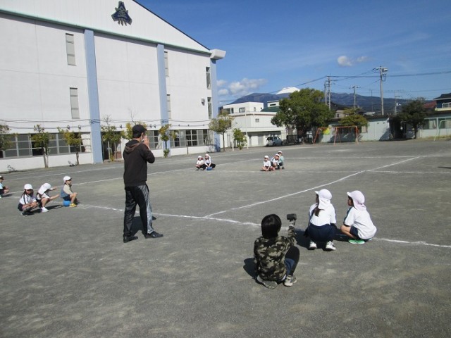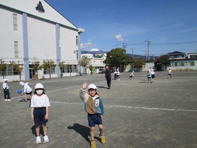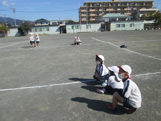 1年2組はボール投げ遊びです。先生から上手なボールのキャッチの仕方について説明を聞いた後、練習しはじめました。上手にキャッチできるようになってきました。