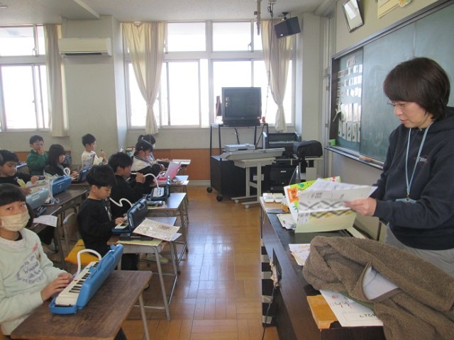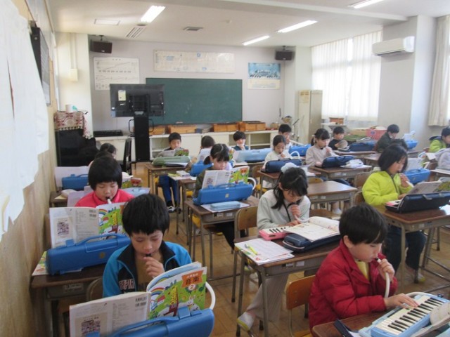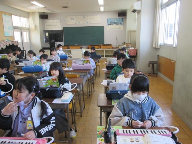 3年3組は音楽の学習です。「かっこう」を鍵盤ハーモニカで演奏しています。みんなの息がぴったり合っていました。