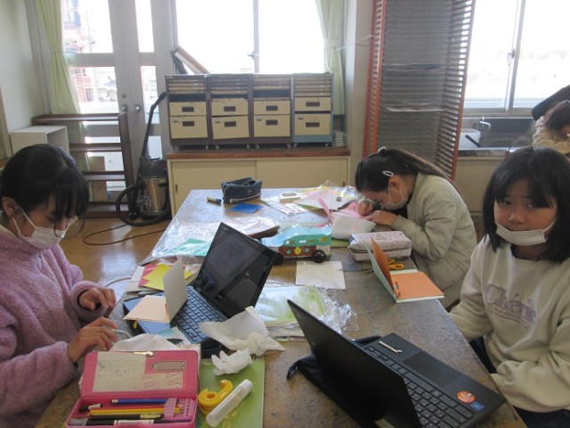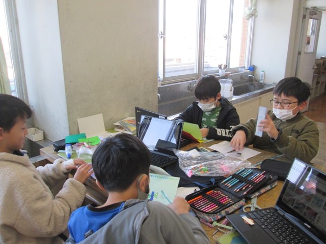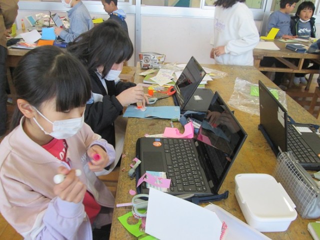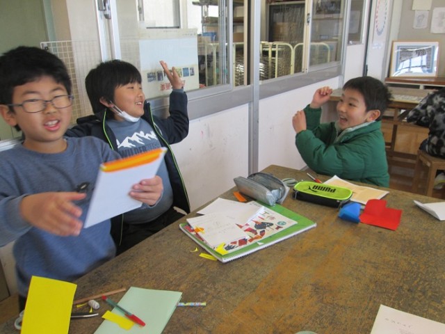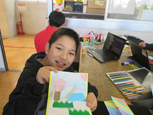 4年1組は図工「メッセージカード」の仕上げでした。「できたよ!でも中は秘密!」という子もいました。素敵なポップアップカードができあがりました。もらった人もきっと喜んでくれますね!
