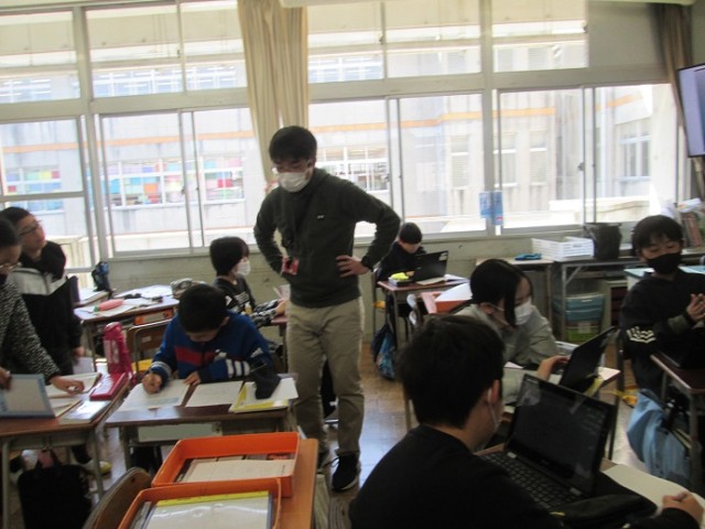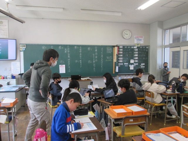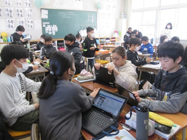 5年1組は、国語「よりよい考えはどっち」の学習です。「暑い国と寒い国」「学校の昼食は給食がよいか」など、それぞれの立場になり、より説得力のある主張を考えていました。