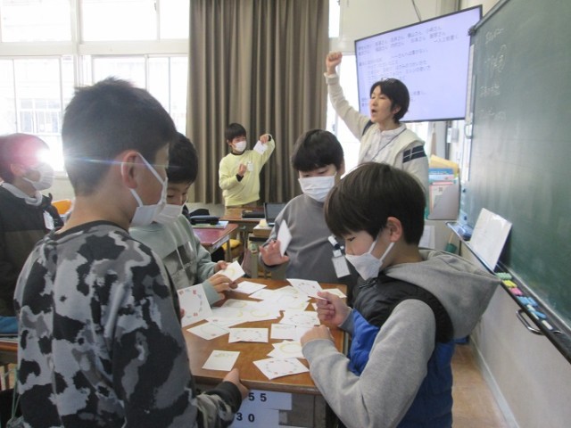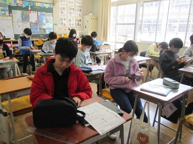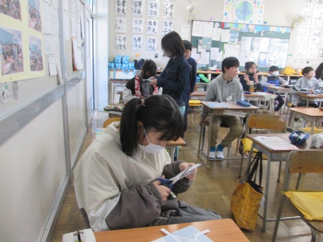 5年2組は家庭科の学習です。授業でお世話になったミシンボランティアの方々へ、感謝のメッセージを作成しています。来年もまたボランティアに来てくださるといいですね。