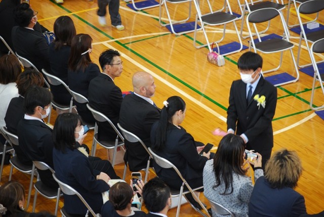 「卒業の言葉」を終え、卒業生が保護者の元に感謝の気持ちを込め花を渡しました。小学校生活、最後の表現の場「卒業式」で皆、それぞれの表現をし、羽ばたいていきました。これからの生活でもつらく、困難なことがあっても、きっと乗り越えていくことと思います。