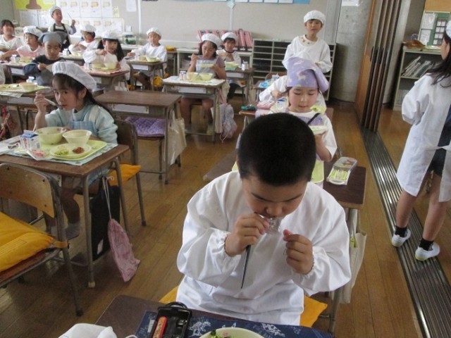 2年生の給食の様子です。なるとに書かれていた文字は「祝」という字と教えてもらったようです。去年は1年生だったみんなは、こんなに大きくなりましたね!これからもすくすくと成長していくことを願っていますよ!