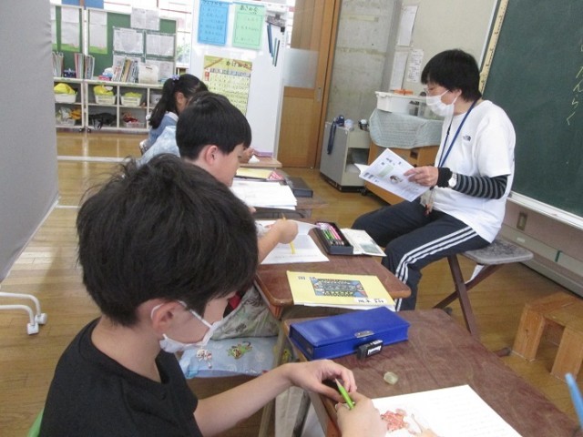 5組は国語の学習です。それぞれの学年に応じた学習を進めています。4年生の4人は「ヤドカリとイソギンチャク」の学習です。