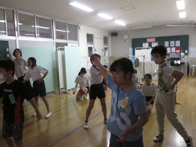 なかよし1~4組はオープンスペースで動画を見ながら運動です。なかなか動きのある振り付けです。4年生の子達は、交流で運動会の学年練習に出ています。