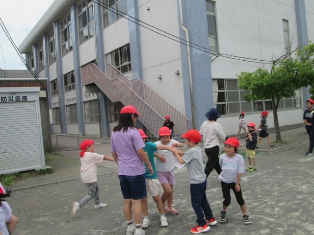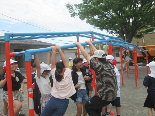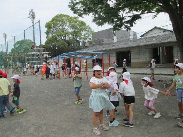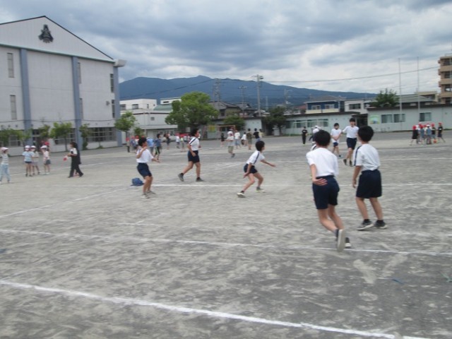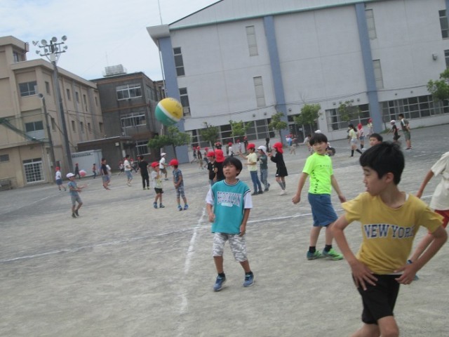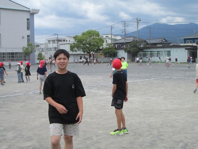 昼休みは大勢の子供たちでいっぱいです。先生方も一緒に遊んでいます。今日は曇り空だったので比較的気温は高くありませんでしたが、湿度は高く感じましたね。暑さに負けないからだと、こまめな水分補給に努めましょう!