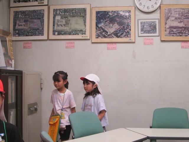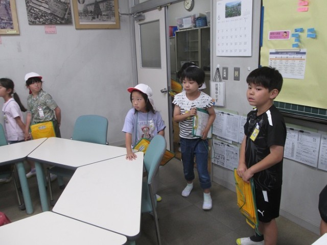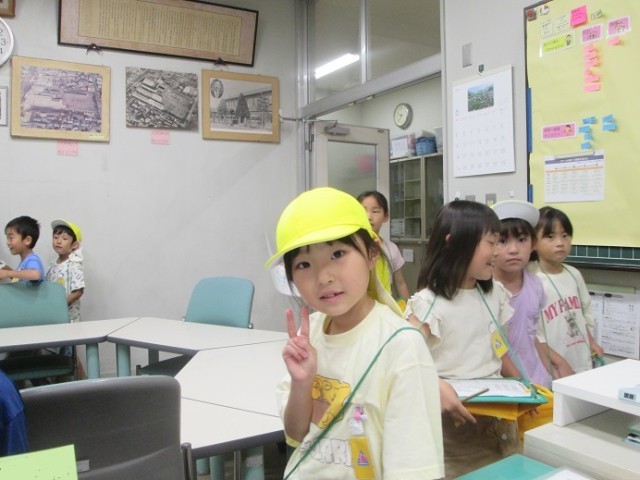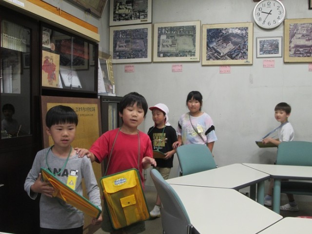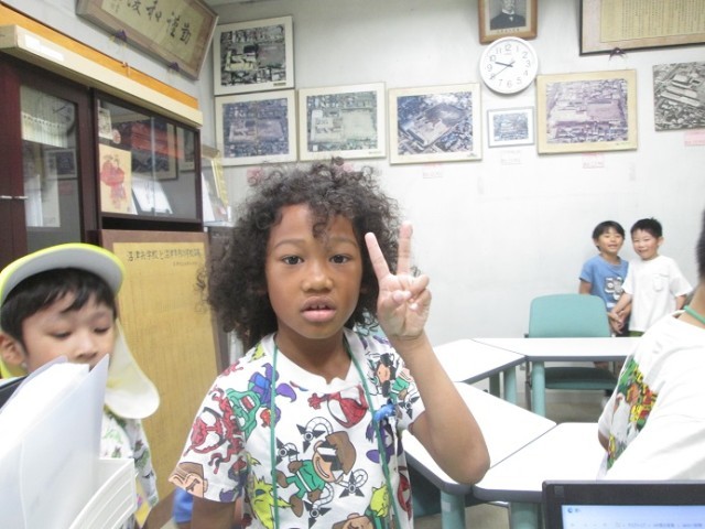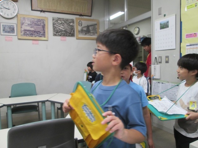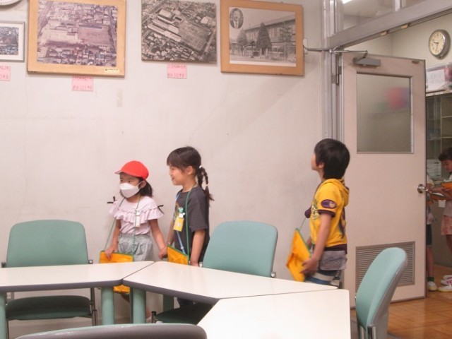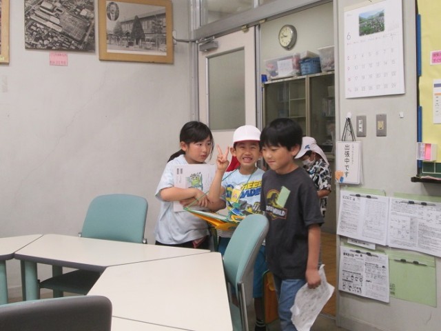 校長室に入ると、「あ、こんなところに金庫がある!」と発見したようです。お金の入っている金庫ではなく、「鉄庫」と呼ばれるもので、大事な書類などが入っていますよ。「へえ~、こんなところでお仕事してるんだ~!」と言う子達も多くいました。また、ゆっくり遊びに来てくださいね。