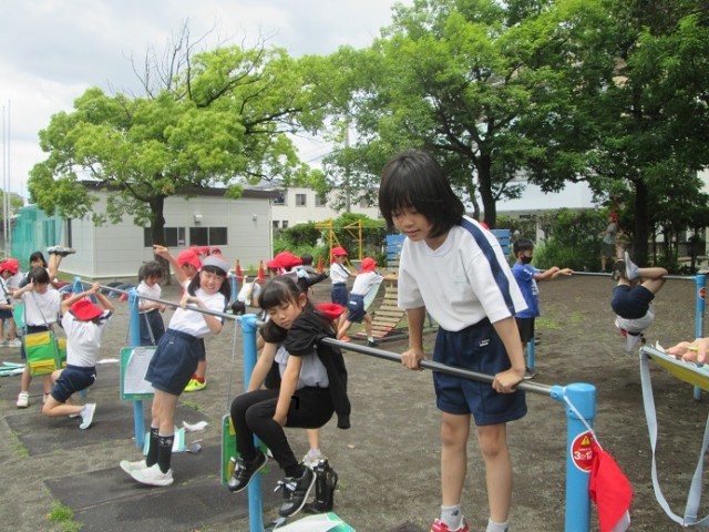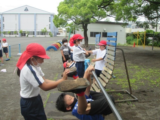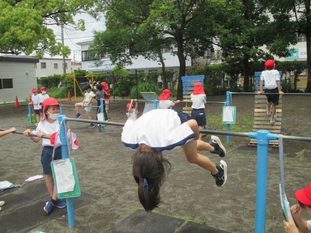 3年1組は体育「鉄棒運動」です。地球周りや逆上がり、連続逆上がりなどに挑戦していました。できる技を増やしていきましょうね!