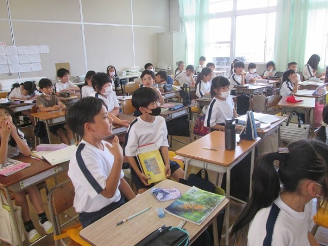 2組は国語「作文」の学習です。作文を書くときの約束として「秘密は書かない方がいいね」という確認がされていました。書いて誰かが嫌な思いをすることは書かない方がよいですものね。
