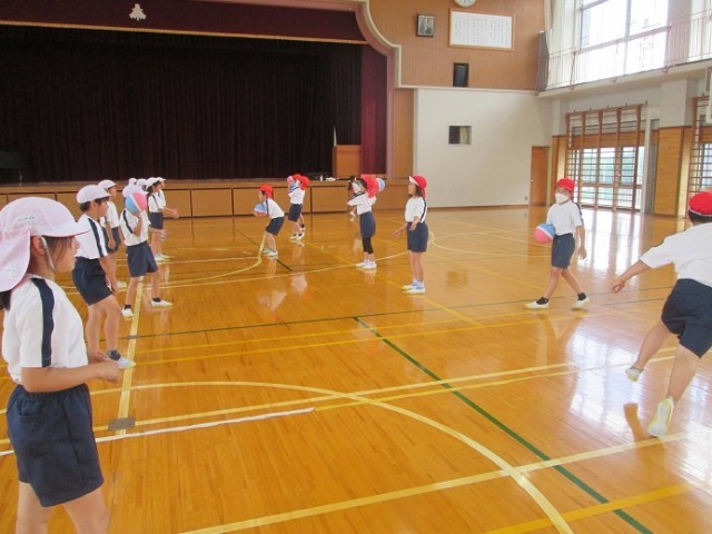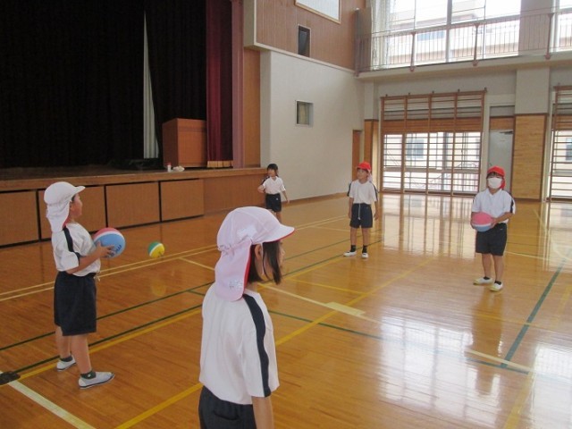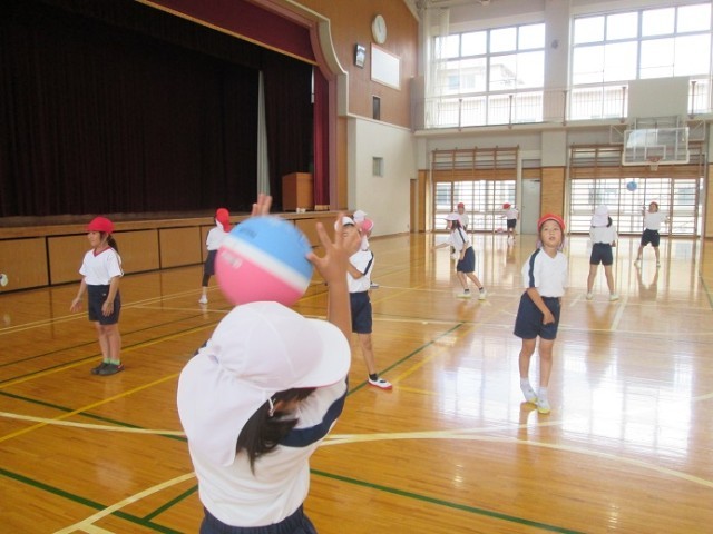 3組は体育館で「ボール運動」をしています。まずはソフトドッジボールを使ってキャッチボールです。投げるのが得意な子もいれば、捕るのが得意な子もいます。どの子も楽しく取り組んでいました。