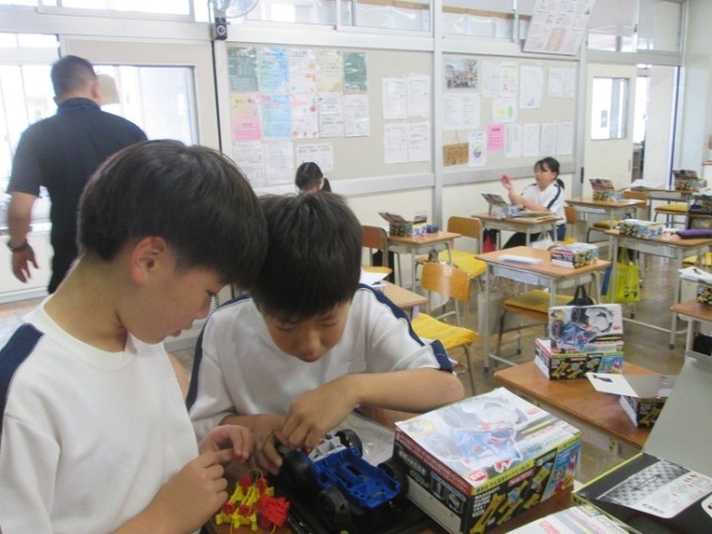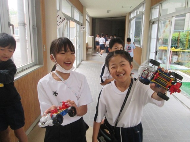 4年1組は理科「モーターカーづくり」です。できた車は廊下で走らせてみました。豆電球も付く車で、走りながらライトが輝くかっこいい車にみんな満足そうな表情でした。