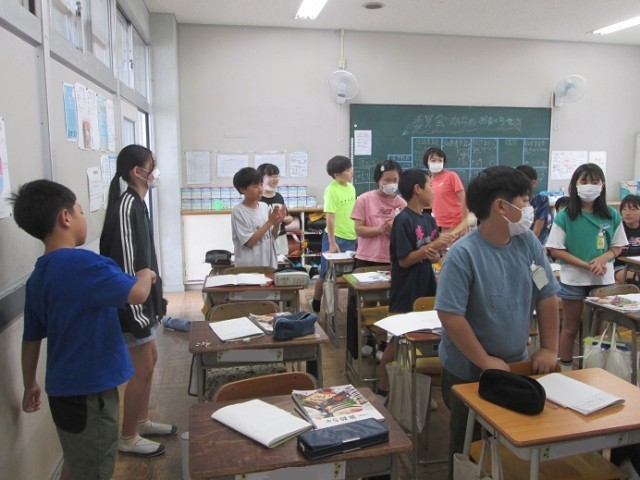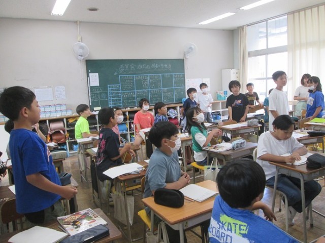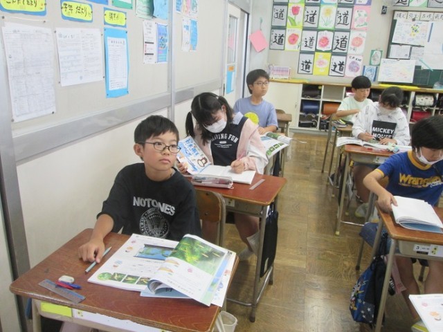 5年1組は算数「パチンナンバーゲーム」です。AB2つのグループに分かれて、Aは3の倍数、Bは4の倍数の時に手を叩きます。なれるまでなかなか難しいようでしたが、落ち着いてやるとしっかり手を叩くことができました。