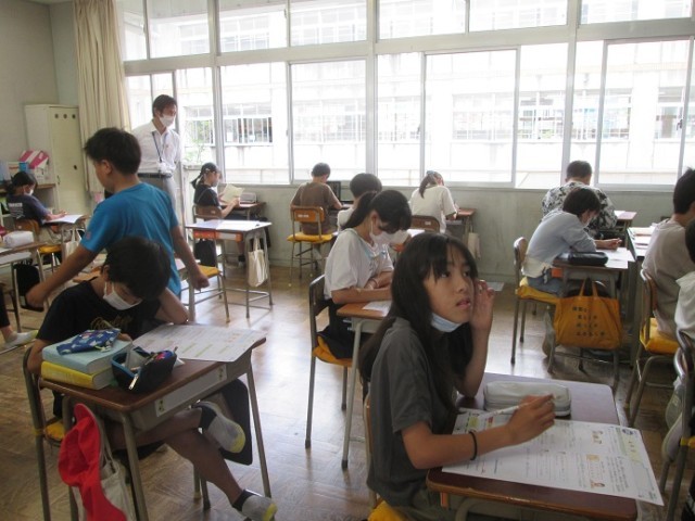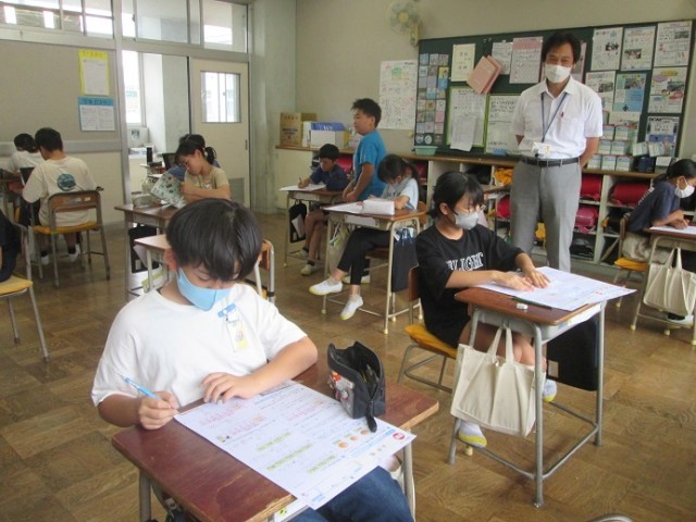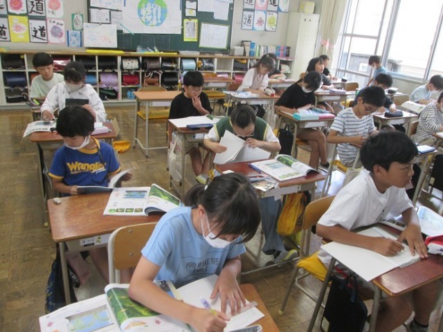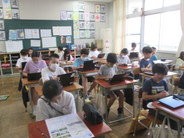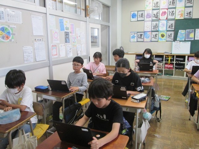 2組は算数「平均」、4組は社会「わたしたちの国土」のテストです。どちらも集中して取り組んでいます。終わった子はChromebookの操作の練習です。