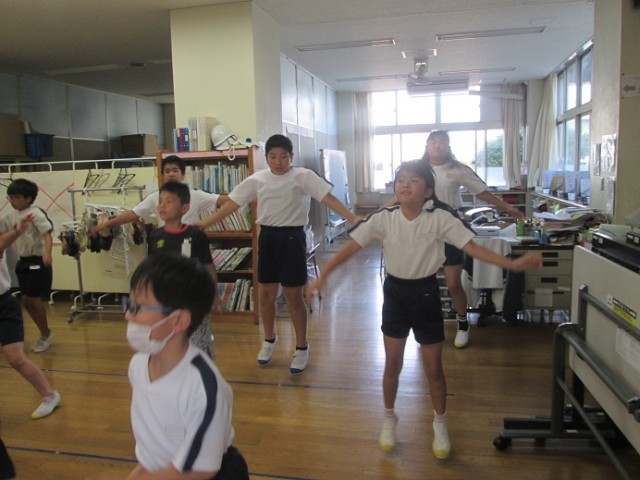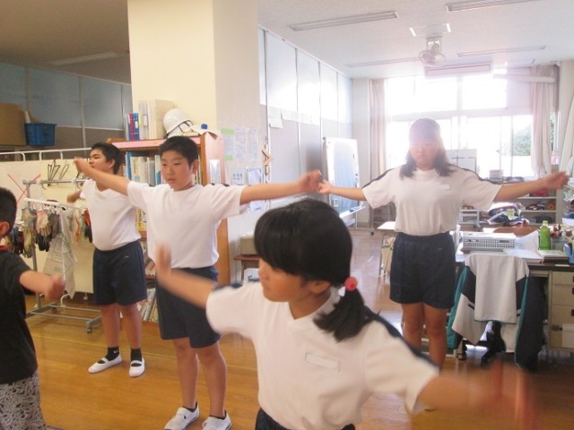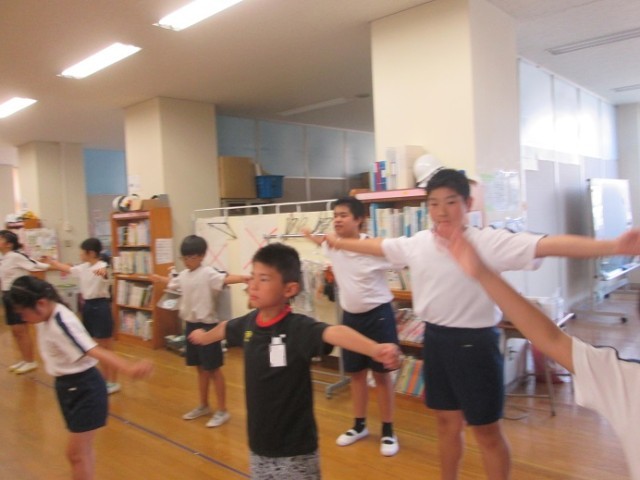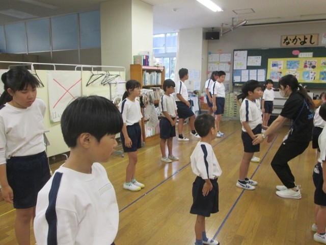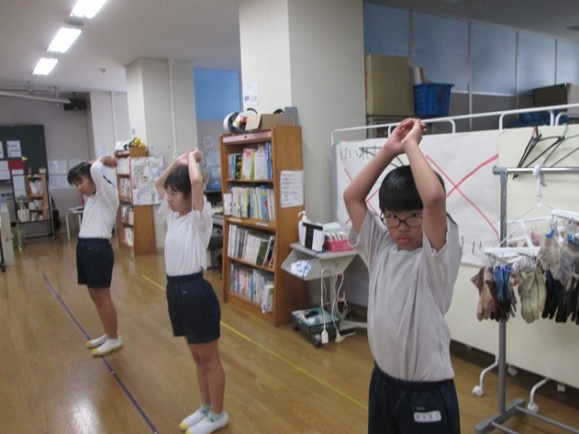 なかよし1~4組は朝の体操です。しっかり体を伸ばしたり、動かしたりします。このあとは、水分補給をして外に出て、外の運動を行いました。