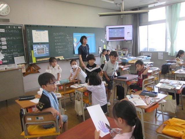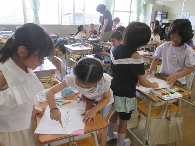 4組は、図工で学級目標づくりとポスターづくりです。学級目標には1人1人の手形が貼られています。