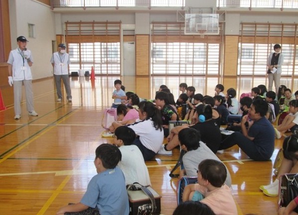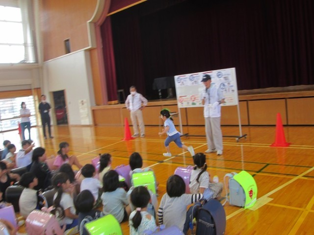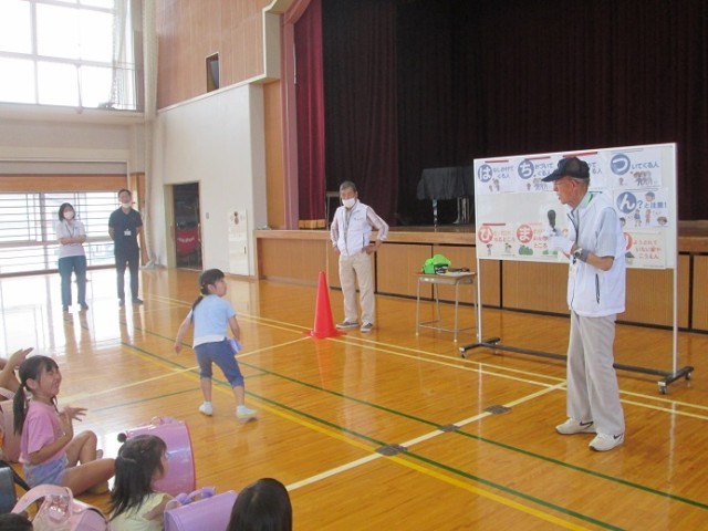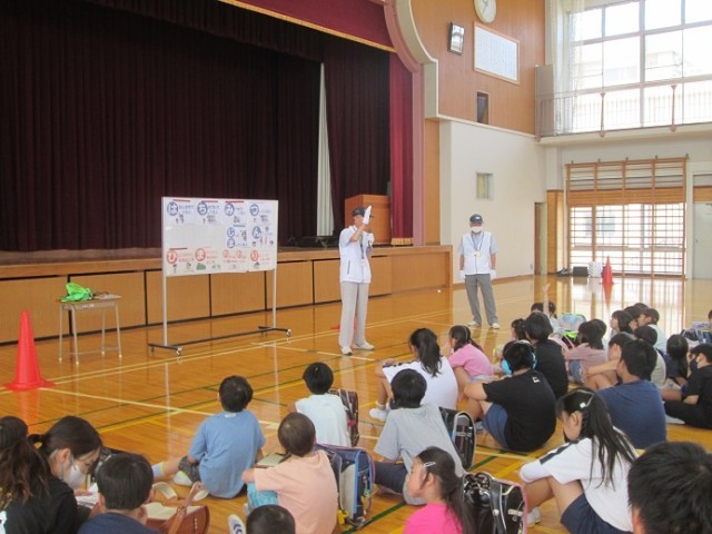 なかよしと1年生は、自分の身を守るために「あぶトレ」を行いました。防災まちづくりアドバイザー、市役所の方々にお越しいただき、不審者から身を守るためにはどうしたらよいかを一緒に考えました。お話に出てきた不審な人の特徴「はちみつじまん」を覚えているかな?お家に帰ったら家の人と一緒にもう一度”はちみつじまん”の人には気をつけることを話し合ってみましょう。